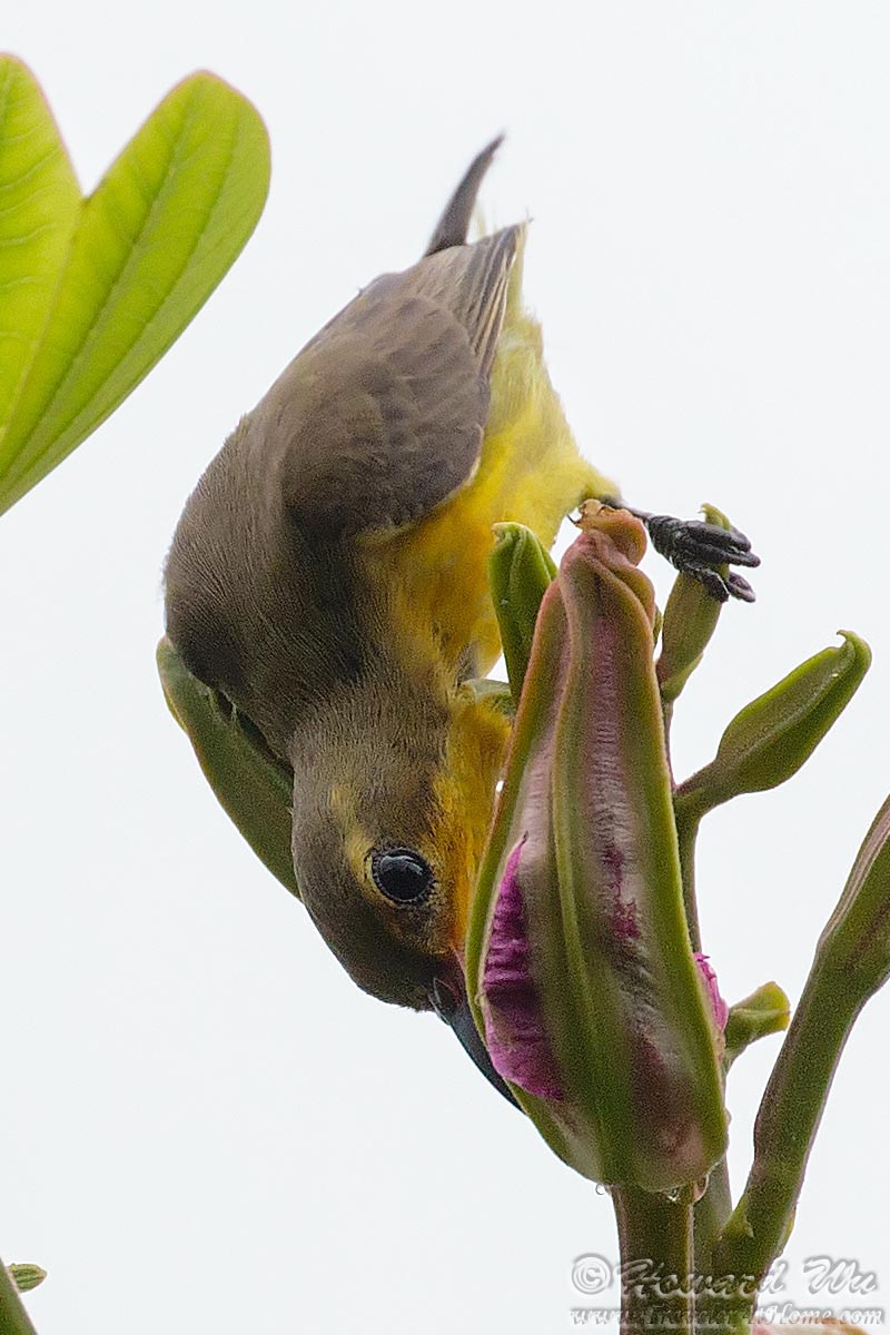 So these were the birds that I had seen before -- they were exciting regardless, but I also did see a few new birds. One of these is the Olive-backed Sunbird. I saw it on our second day in the hotel garden, although I did not know its exact species, I instantly recognized it as a new bird, the first of the Sunbird family that I had ever seen. True to its name (the scientific name of the family is Nectariniidae, Nectar-drinker?), it busily probed flowers for nectar.