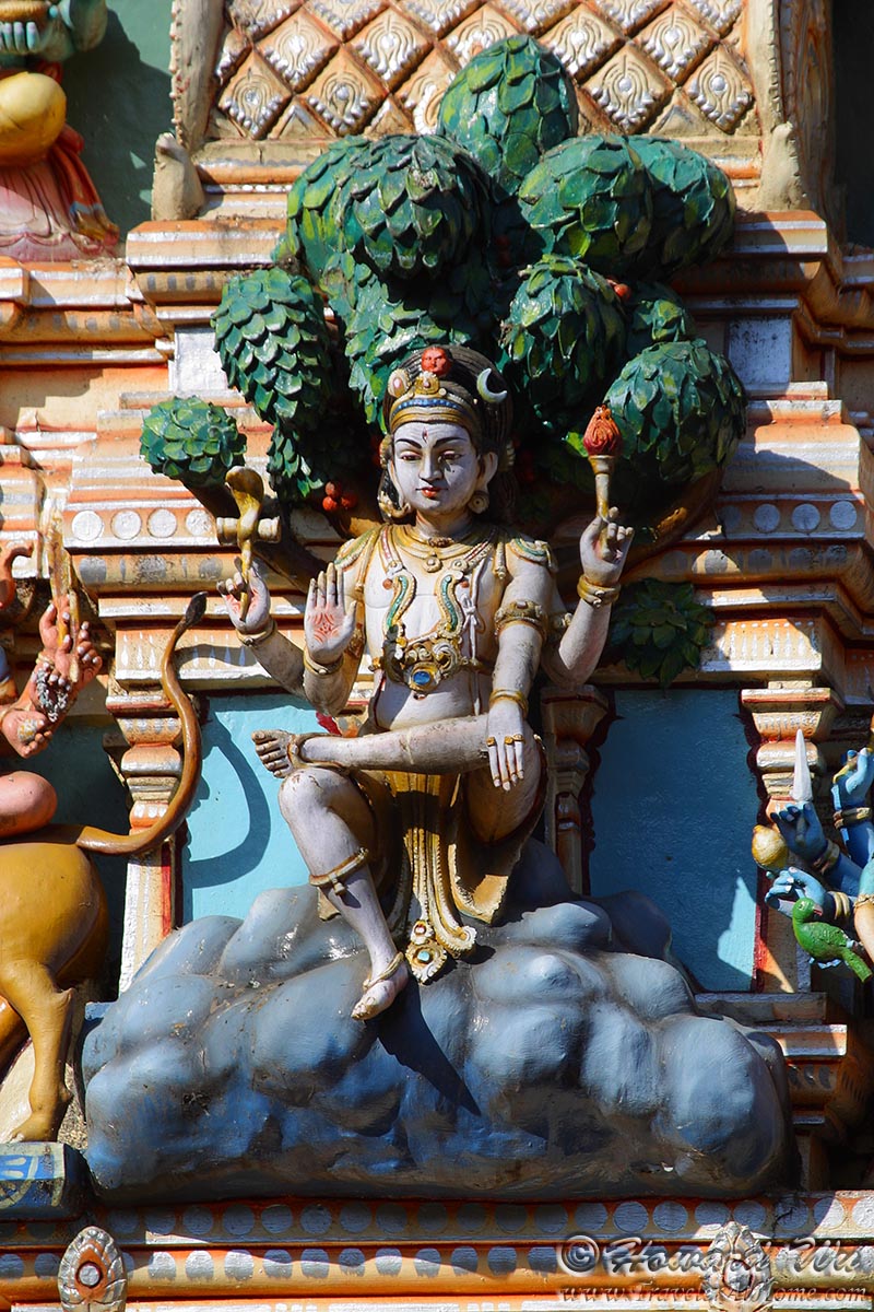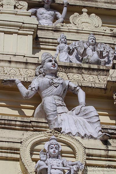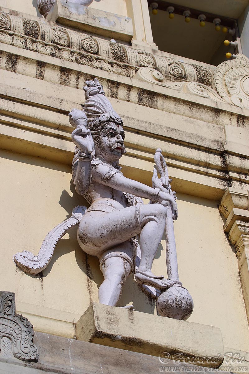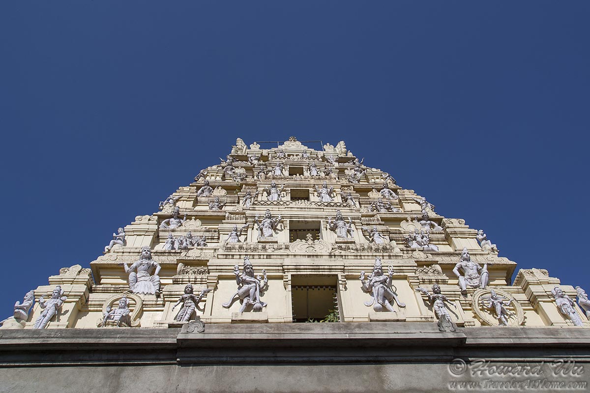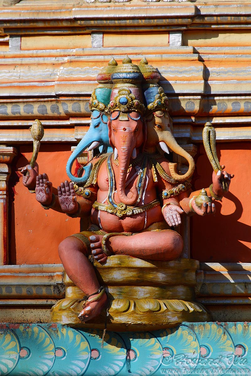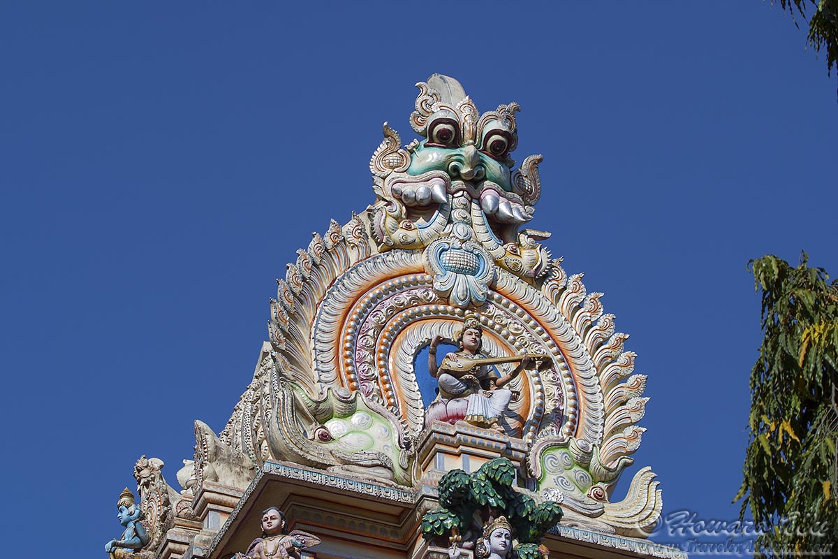 The exterior of the temple is adorned with reliefs and sculptures of Hindu religious theme, some are very colorful.