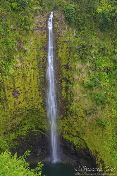 Another, even prettier, waterfall is Akaka Falls, with water tumbling down the lush lichen and fern covered cliff.