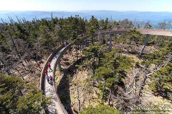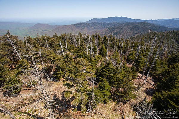 On our last day in the park, we climbed up to Clingmans Dome. At 6,643 feet (2,025 m), it is the highest mountain in the Smokies, the highest point in the state of Tennessee, and the highest point along the Appalachian Trail. They even built an observation tower on top of it, and the view is panoramic. However, you can see a lot of dead Fraser Firs ravaged by balsam woolly adelgids, which put a somber mood to this view.