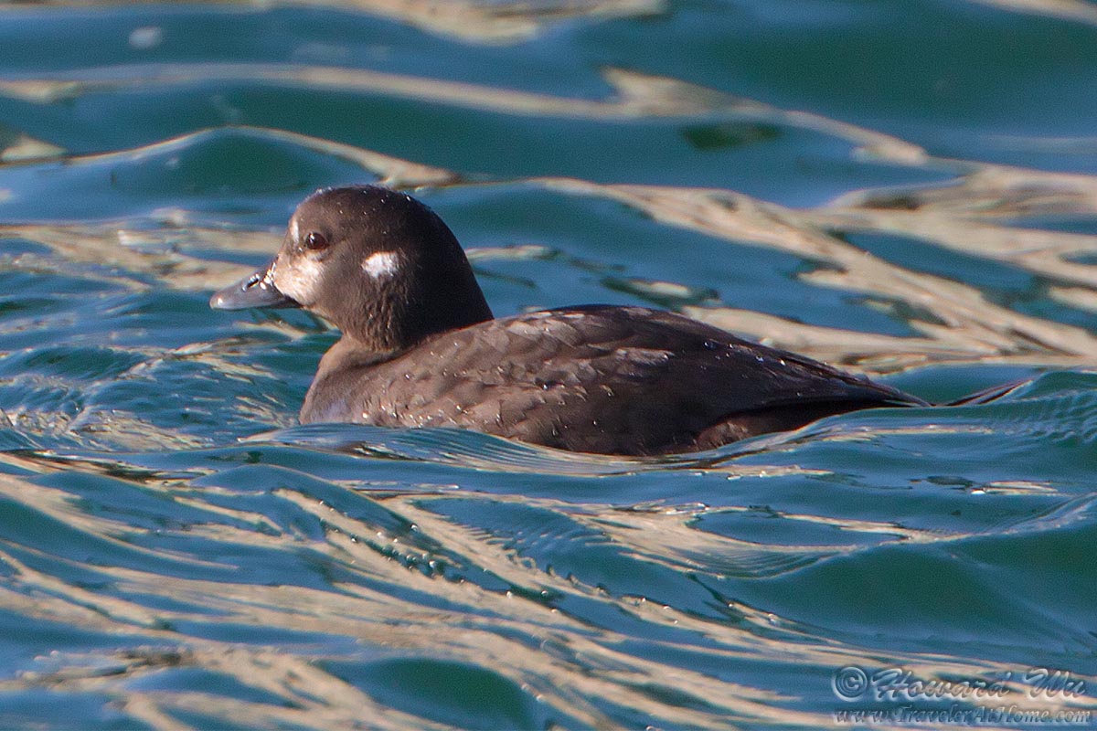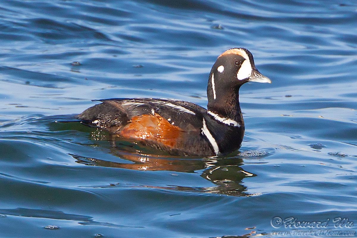 In the early morning there were many birds on the water around the pier, such as these Harlequin Ducks.