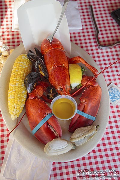 After checking into the motel in Wellfleet, we went to Moby Dick for dinner. Cape Cod is known for its seafood, and naturally seafood was what we ordered — a lobster and a bucket of "steamer" clams and mussels.