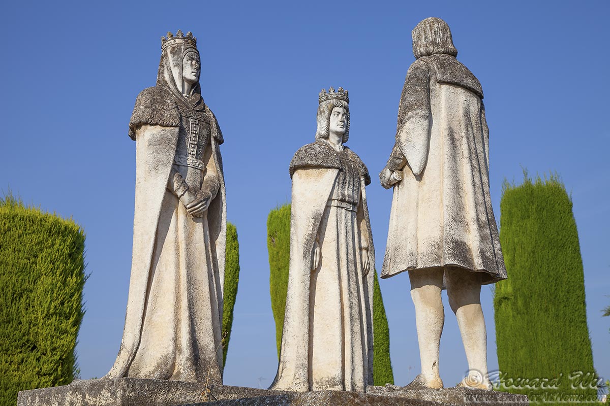 Three statues depicting Fernando and Isabella summoning Christopher Columbus.