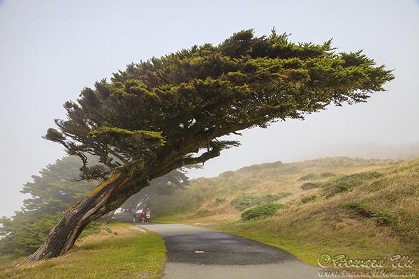 Being a "headland" (meaning jutting out from the mainland to the ocean), Point Reyes is one of the windiest place in the world. The incessant wind blowing from the Pacific sculpted -- and slanted -- the trees in high places, such as the cypress tree shown below. We were at the headland in dense fog, and witnessed how the trees capture the nourishing moisture from it (notice the wet spots on the pavement below the tree).