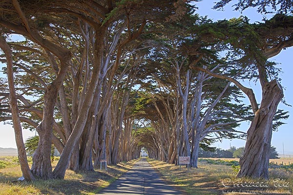 In some places, such as near the Point Reyes Marconi Station, towering cypress trees formed overarching "tree tunnel":