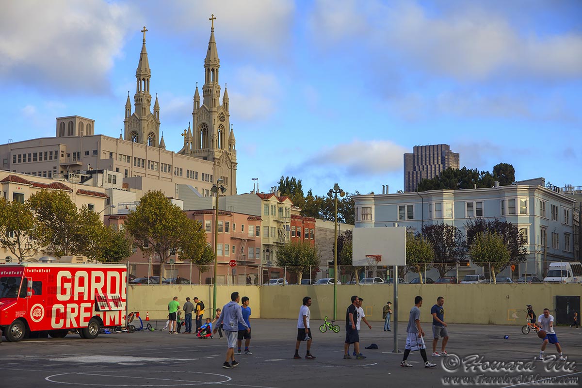 A walk toward Little Italy and Chinatown takes us past a playground with the St. Peter and Paul Cathedral in the background.