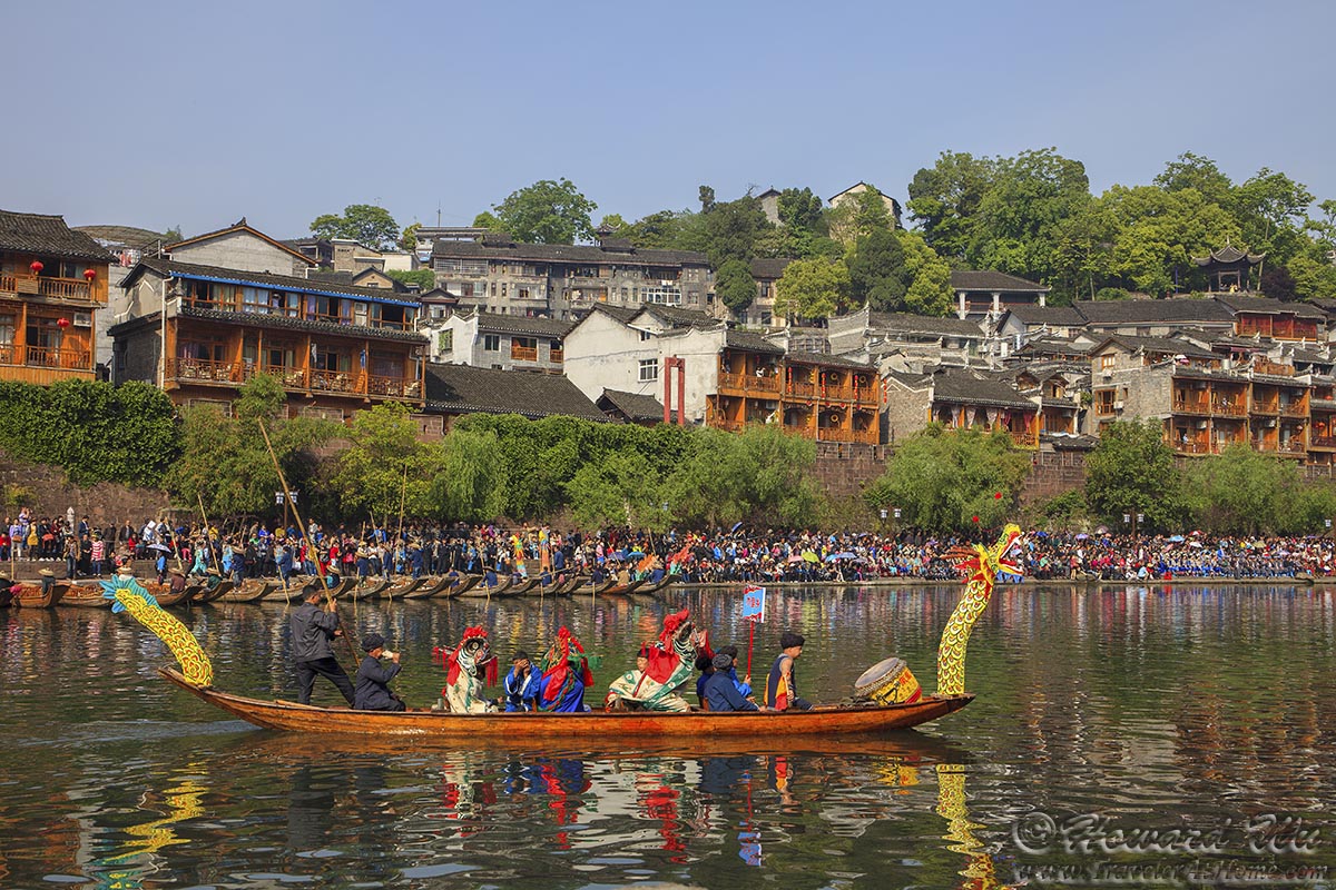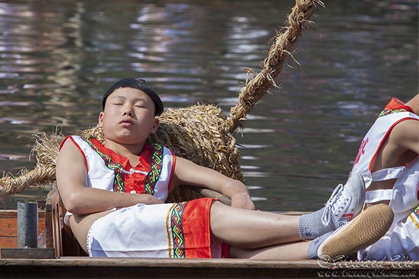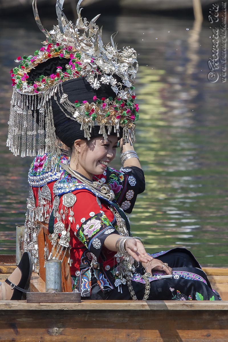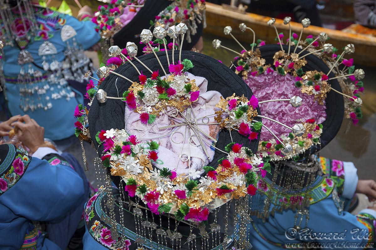 As luck would have it, not only did we get a warm sunny day there, it was also the April 8th (on the Lunar Calendar) Festival of "Jumping Flowers" (跳花节) of the Miao minority (苗族). Local people dressed in their native clothing and headdresses crowded the river in canoes and boats. The Miao women's headdresses are something to beheld -- they are laced with intricately hand-made silver decorations.