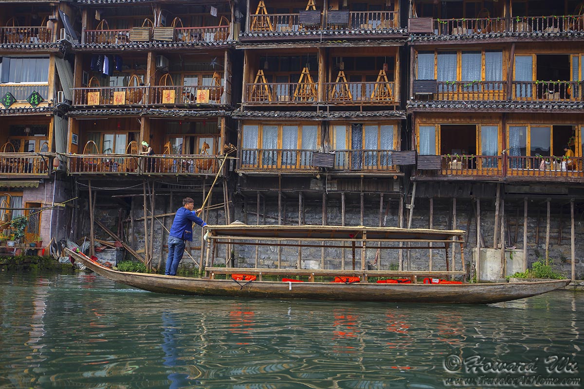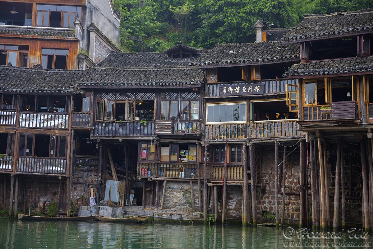 But the most unique building are the stilted houses (吊脚楼) -- houses built on stilts that extend into the water, popping up the houses above the river.