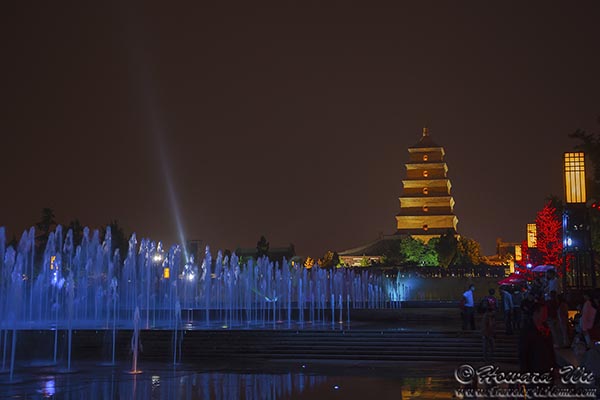It started to rain when we got back to Xi'an. We managed to visit the Giant Wild Goose Pagoda, a temple built in 652 AD to hold the sacred sutras brought back by the famous monk Xuanzang. But now just outside the pagoda, there is a very large array of fountains, which they light up and play music that's synchronized with the sprouting water at night. I am not sure how Xuanzang would feel about such worldly bustle.
