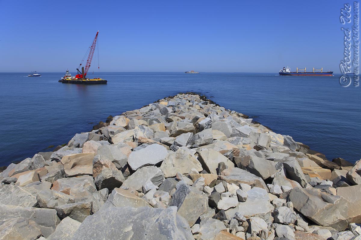 My next stop, after a quick lunch, was at the Chesapeake Bay Bridge and Tunnel (CBBT). This was the second time I drove through this engineering marvel. It really is an interesting structure -- it is part bridge, part tunnel (hence the name), and the road sometimes spans over the water, sometimes dips underneath (twice), quite an experience to drive through it. The following picture was taken at the northern end of the first manmade "island" where the road just dips under the water -- you can see the second "island" in the distance, and in between them is the shipping channel where the tunnel lies underneath.