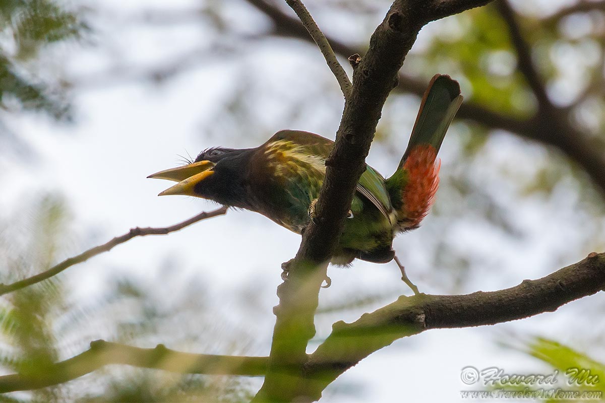 But my last new bird came rather unexpected, and it was probably most exciting -- I heard loud calls from a tree and looked up: there it was, a Great Barbet (大拟啄木鸟)! Arguably it was my first true tropical bird, it is gaudy in color as loud in the noise it makes.
