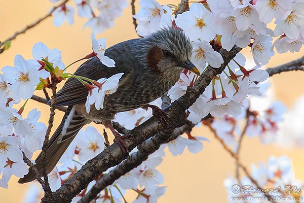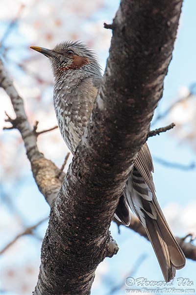 In the cherry trees, I spotted my second new bird of Japan -- Brown-eared Bulbuls. These noisy birds are apparently very fond of the nectar and pollens of the flowers and were darting ecstatically among the branches.