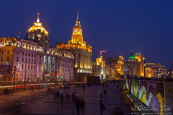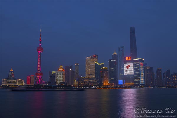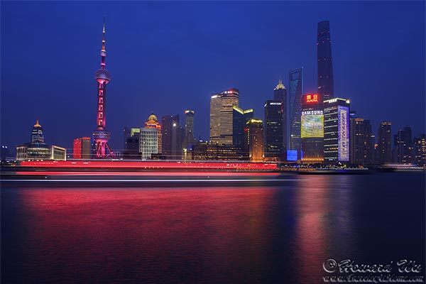 Across the Huangpu River (黄浦江), the last tribunary of the mighty Yangze, is the neon-lit Shanghai skyline. On the left is the famous bulbous Oriental Pearl, and on the right the tallest buiding is the Shanghai Tower, still under construction at the time of our visit.