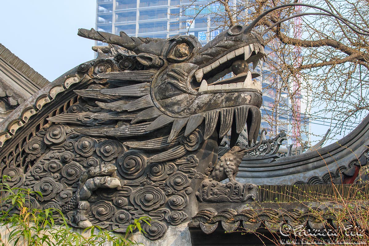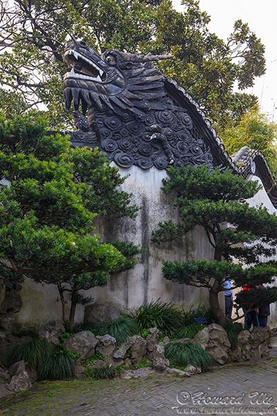 One of the interesting features of the Yu Garden is the Dragon Wall, where a brick dragon statues or carvings adorn the undulating tiled ridges of the wall.