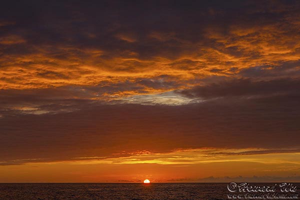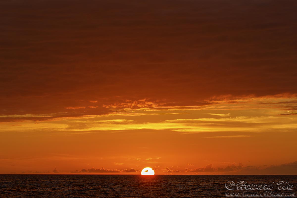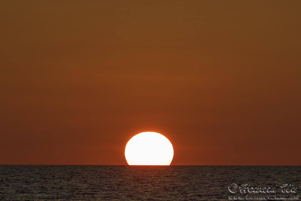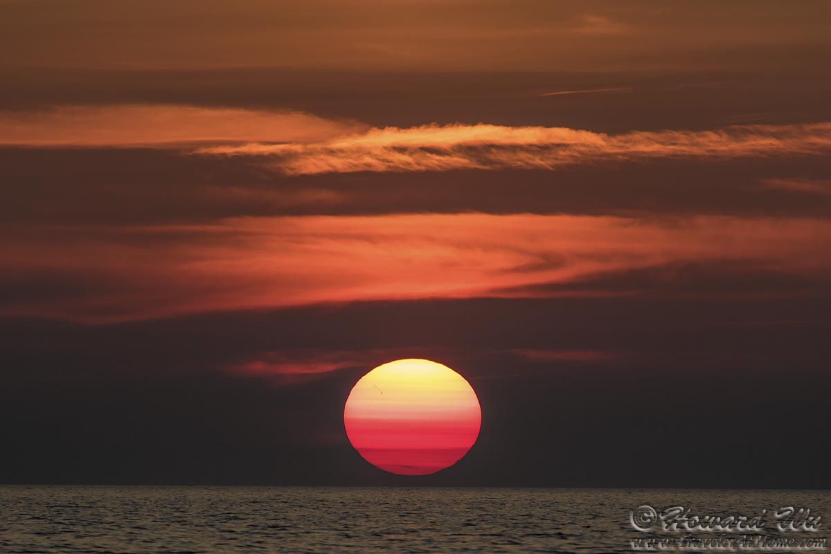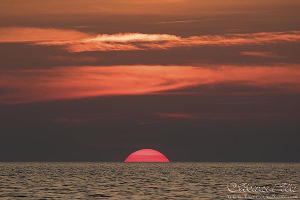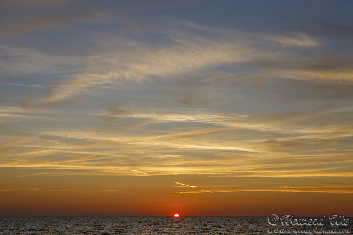 The great Heraclitus once said "You can not step twice into the same river", I say: you can not watch the same sunset twice. Every sunset is unique and beautiful in its own way -- sometimes the sun is clearly visit and sets like a shiny disk, sometimes it is veiled by bands of clouds that create subtle hues, sometimes the cloud formation in the sky is spectacular ... I never tire of watching sunsets.