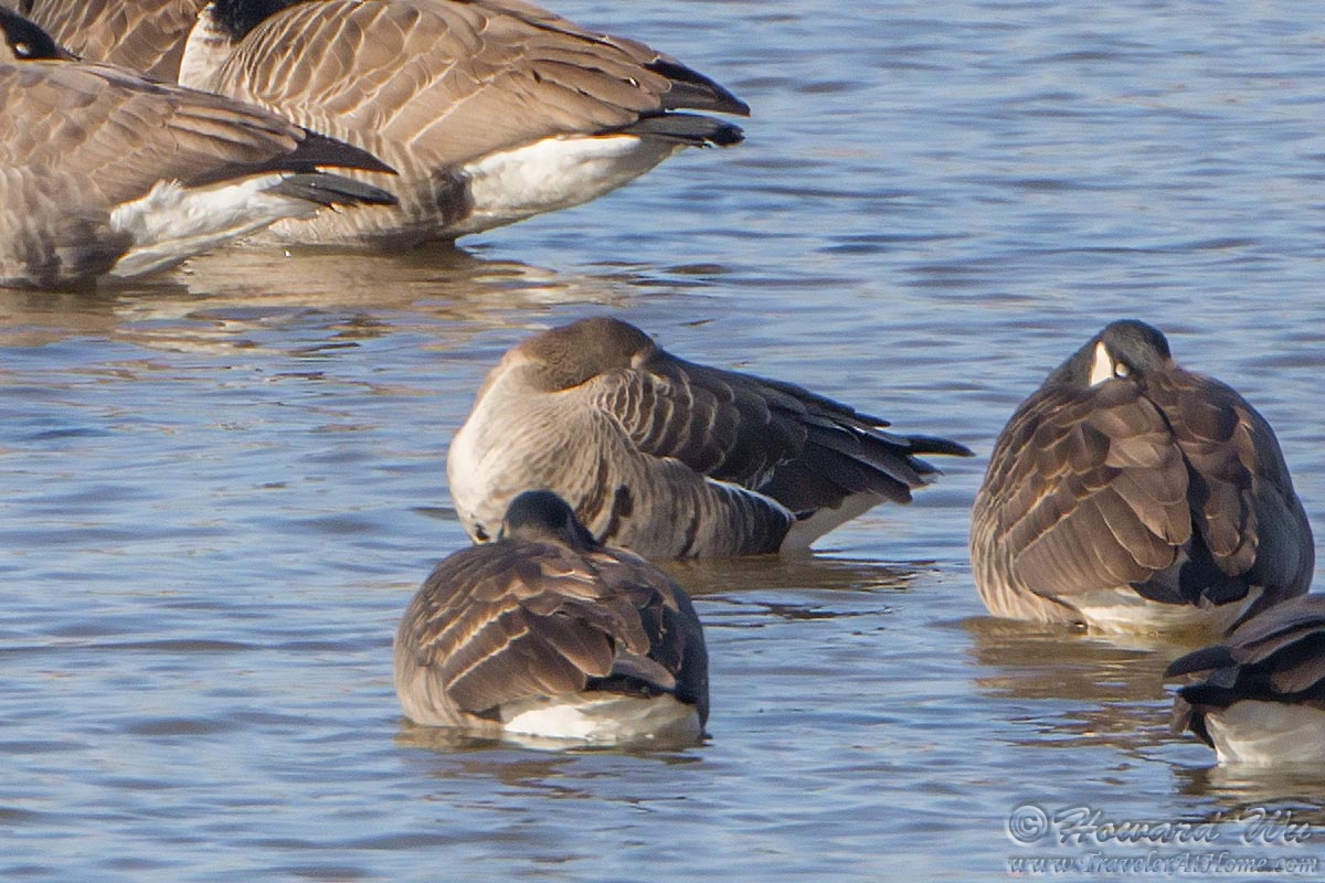 After lunch I went to Dyke Marsh in Virginia. The day before -- New Year's Eve, that is -- I actually got a new bird here: a Greater White-fronted Goose. But, at that time, it had its head tucked under its wings and I did not even see its face (see the first picture). Not satisfied, I tried again today. After much searching and scanning (among the hundreds of Canada Geese), I finally located it again. Initially it was very far, but I spent a few hours there, and eventually my patience paid off and I got a decent shot of it with its face clearly shown.