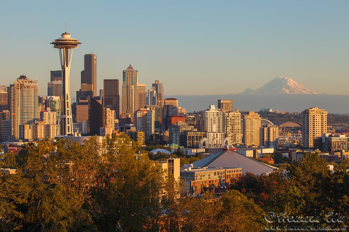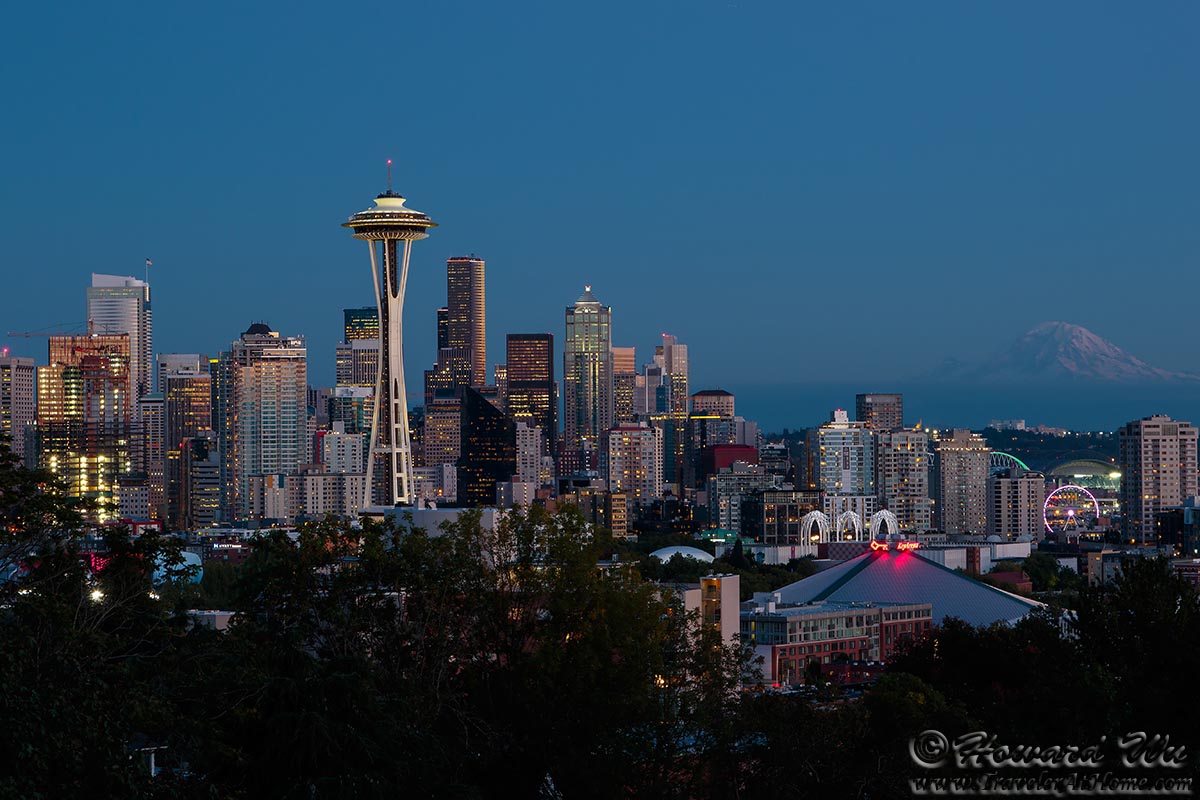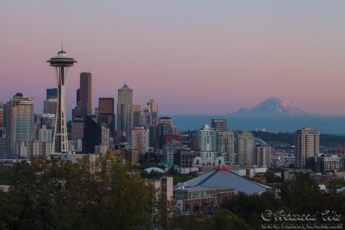 The highlight of our stay in the city no doubt came when we went to Kerry Park, which offers stunning views of Seattle downtown and environ. We were lucky to have a week of nice weather in the city and to see Mount Rainier glowing in the sunset and the city sparkle when the night came on.