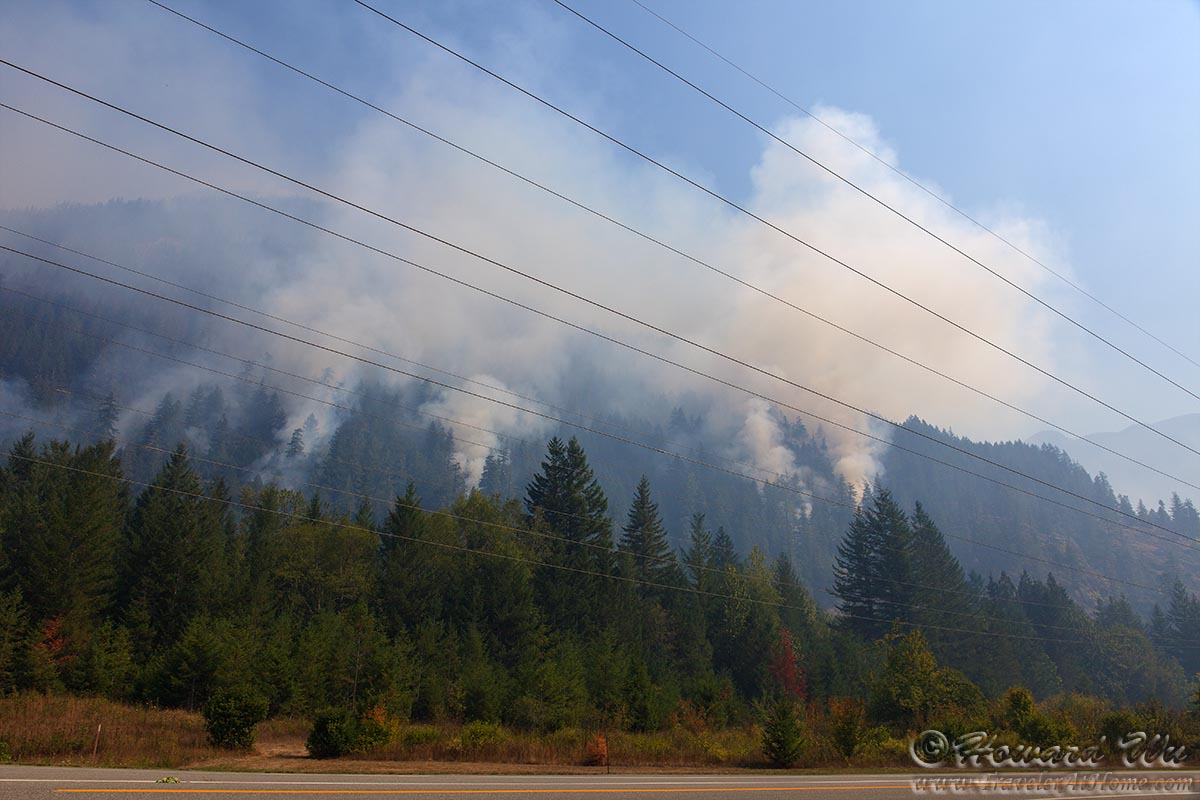 I had planned to return my car before 7PM in Seattle and there was almost enough time. Ominously, a helicopter flew overhead toward west, the way I would go. The scenery from this road toward the west is spectacular, with a sheer wall of mountain in the front. I stopped on the road shoulder to take some pictures, now I could see that there were more smokes in the sky. Then as I continued, a couple in a white truck waved “turn around” signal to me and I stopped to talk to them. The road was closed, they told me. They are very friendly. I asked for directions to get back to Seattle. At this point, I knew I was in for a long trip back.
