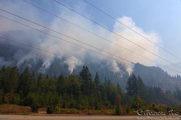 On a whim I decided to take a day off and go to North Cascades National Park. But as I got closer to the Cascades, it got very smoky. I heard on the radio that there were many wildfires. I hesitated … I had gone that far and did not want to turn back, but clearly, I would not see much. At 10:30 I entered the park and there was fire on the slope right across the visitor center. I went into the visitor center and talked to the rangers. I asked them if there was road closure (there was none). I knew they would not give any guarantee. I studied the trail maps again and told them that I would just go see some waterfalls then turn back. They said it was a “good call”. So thus I left the visitor center with this plan. I stopped across from the road again and took some pictures of the fire (this would be the “Goodell Fire”.