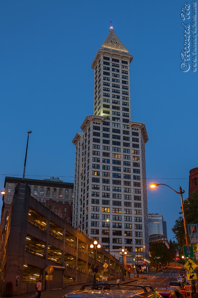 Smith Tower glowing in the dusk on our way back from Chinatown.