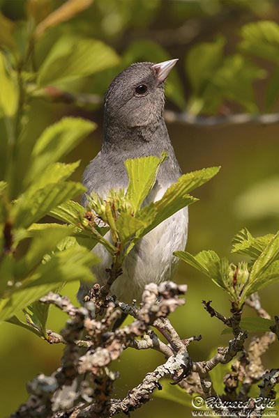 There were stands of fiddlehead ferns in the swampy areas around the lake. These dedicate plants were just sending out their furled fronds, covered with fine, filamental hair. A Dark-eyed Junco flitted in the trees. Unlike most other migratory birds, which employ a latitudinal migration strategy – that is, they migrate from north to south and back, juncos migrate attitudinally – that is, they spend their winter months in the lowlands and migrate to their breeding grounds at higher elevation in spring and summer. To me who lives near the coast, they are decidedly a winter bird, but in summer I always expect to find them in the mountains.