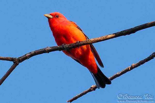 I went outside my tent. The day was breaking already. A Scarlet Tanager flew above my campsite. “Sweet”, I thought, not often one wakes up and sees a Scarlet Tanager. Then it perched on a tree branch right above my head. This begged for pictures. I quickly opened the trunk of my car and got out my camera and snapped a few pictures.
