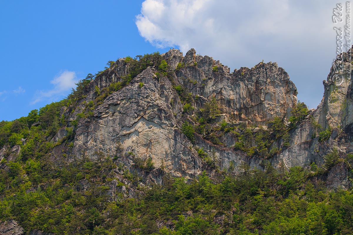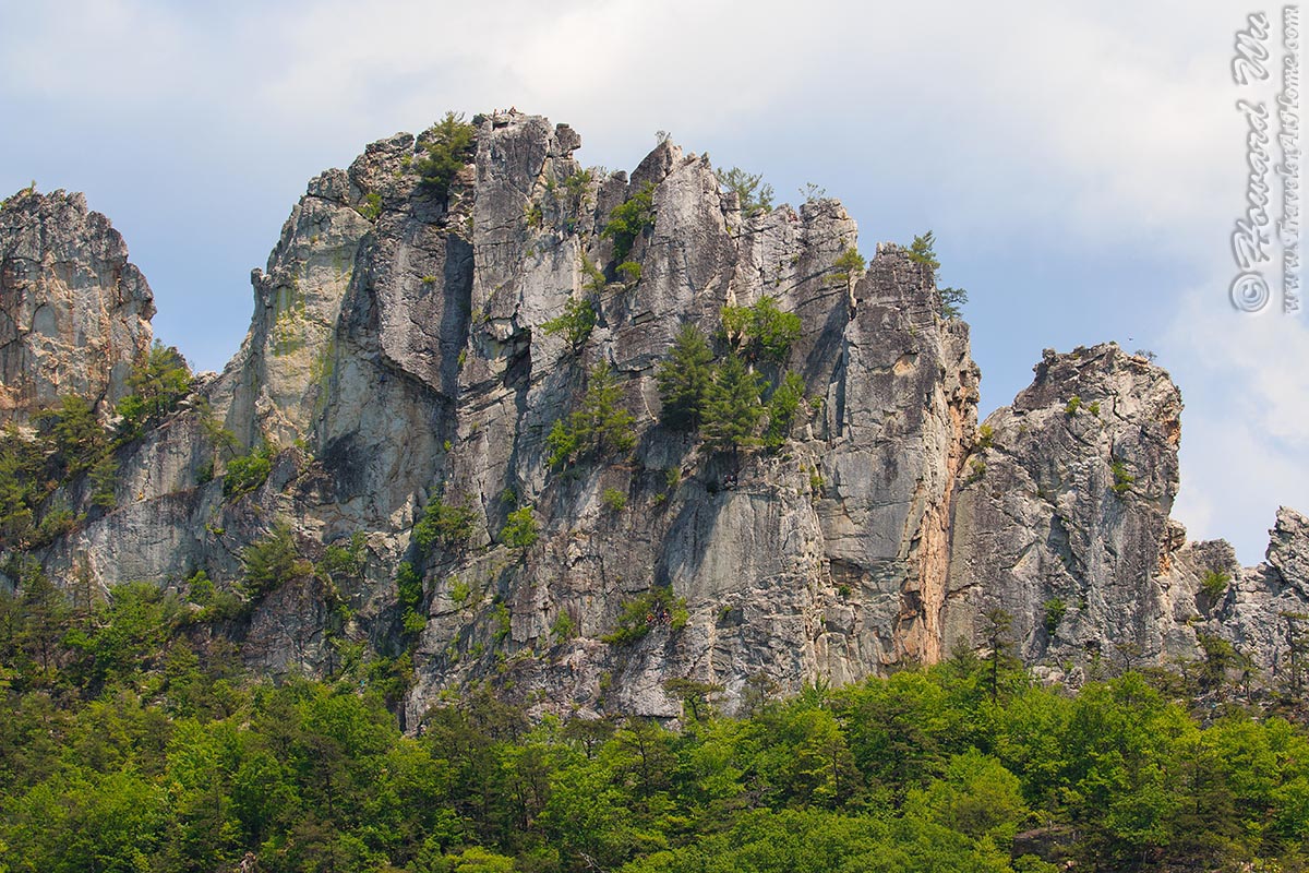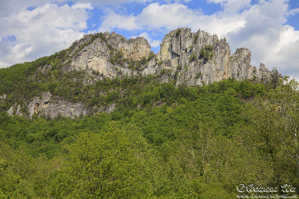 I arrived at the visitor center at Seneca Rocks at around 1:45PM. Composed of Tuscarora quartzite , Seneca Rocks is the most dramatic rock formation east of Mississippi. Its saddle-shaped peaks rise some 900 feet from the valley floor. Though modest in absolute elevation (just over 2,400 feet), its almost sheer cliffs and craggy contour give it an imposing character. The west-facing rock surface just came into the sun, and there were many clouds, some rather thick, in the sky. I went into the visitor center and talked to a park ranger, who gave me some maps and directions to Spruce Knob Lake Campground. I decided to wait there for some time, half hoping the clouds would be blown off or dissipate. I had taken the hike to the top (actually not the top; only rock climbers can get to the very top, but there is a wooden viewing platform near the top at the end of the hiking trail) 10 years ago; I thought I would take it again the next day on my way back. I waited, leisurely watching the rocks and the rock climbers. The clouds never dissipated, and I finally left at 3:20PM.