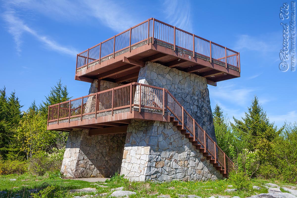 Finally, to the top! I was surprised to see many cars in the parking lot at the summit as the traffic was light going up. A sign commemorates “the Top of Mountain State” (at 4,863 feet or 1,482m). But the walk to the observation tower was rather anticlimactic – the top of the mountain is very flat, the walk is only 900 feet, with no perceptible elevation change. I did not even change to my hiking boots and just wore my sandals. The observation tower has panoramic views, but the sky was overcast, a blue-gray haze hung in the air. An Eastern Towhee, hidden in the spruce nearby, repeated its raspy “drink-your-tea” song. Not to be outdone, an Indigo Bunting also sang its whistling notes incessantly in the distance. How funny, I thought, neither bird had a melodious song, but you could feel their exuberance on the top of the mountain.