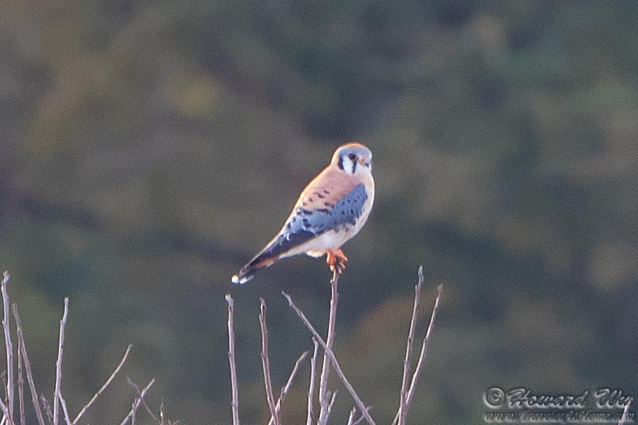 Then I noticed a bird perched in a bare tree in the distance. It flew from the tree to the ground, apparently hunting some small animals or such, then flew back to its perch. It repeated this several times. At first I thought this was the shrike, but to my surprise, in my camera viewfinder with a telephoto lens I saw that this was an American Kestrel. Its behavior was quite similar to that of the shrike. I could not get close to the falcon, though, and only got a few blurry pictures.