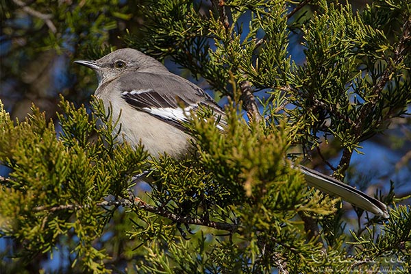 I walked around the woodland, observing and photographing other birds. It was very birdy this morning, despite the cold. At one point, I saw a Northern Mockingbird -- one of the impersonators of the shrike (in coloration it is rather similar to the shrike although differs much in body shape, in the distance can be mistaken for the latter). It was chowing down juniper berries.