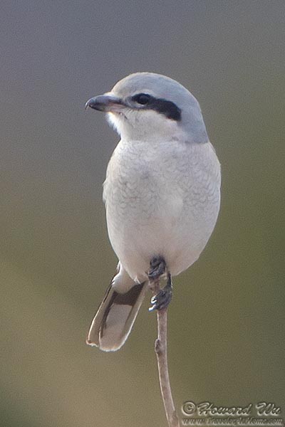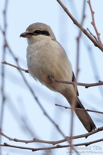 I walked about for about an hour – from the field to the barn and back and forth, without seeing the shrike. At 2:30PM, I really had to go. I decided to take a last look into the field. Ah, my sharp eyes! I picked up the shrike in the distance, in a tree along the western edge of the field and near the cedars. I walked into the burned field (which soon will grow thick shrubs) and moved closer. And closer. Amazingly, it allowed me to get almost right next to the tree. I had the best viewing to date (it is a slight pity that the midday sun was very harsh; photographers are ever greedy). It eventually flew across the dirty road, but still perched close. I took a few more pictures. It flew north, and I really had to go.