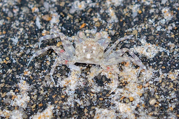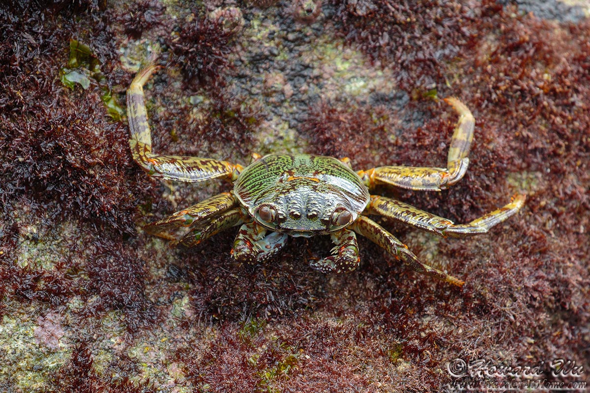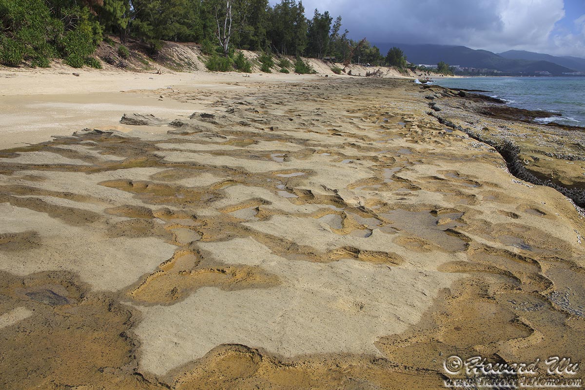 The southwestern end of Yalong Bay is less developed (relatively speaking) and still has some tidal pools and rock formations. I saw two kinds of crabs there -- one very pale, almost ghost-like, perfectly camouflaged against the light-yellow sand, and another very pretty one. Some of the rocks are also encrusted with barnacles(?).