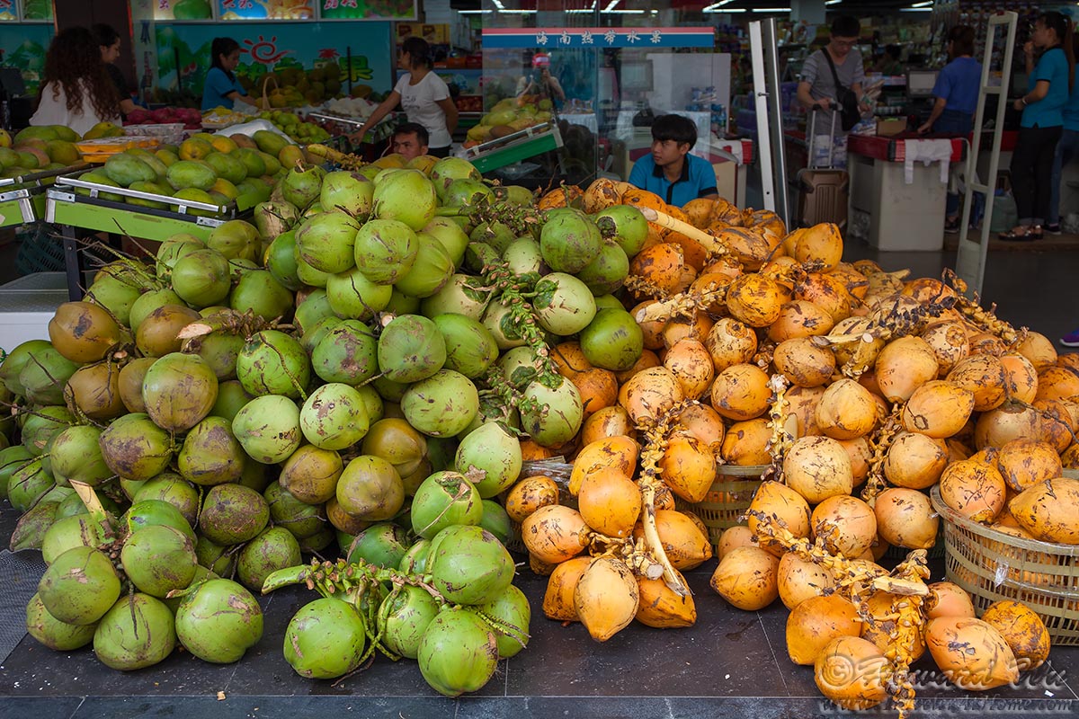Of course, Hainan being a tropical island, there are vendors selling tropical fruits. This picture shows the piles of coconuts at a store.