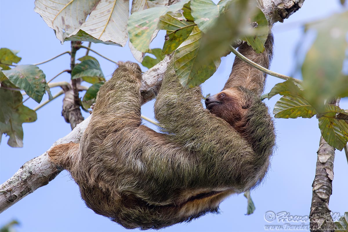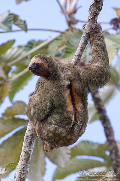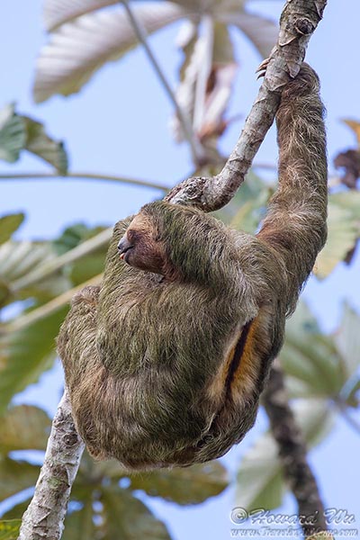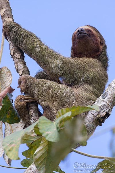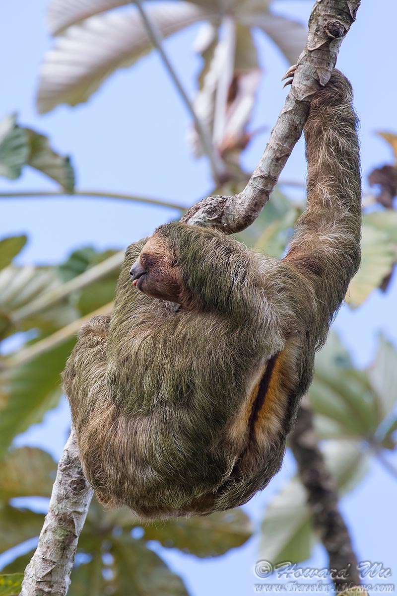 But we had yet another exciting sighting awaiting us -- on the way back, the driver or the tour guide spotted a Three-toed Sloth on a tree by the road! This was a very large male (identified by the dark line down the center of its back), climbing leisurely in the tree, in bright sunlight. I seized this opportunity and took many succulent pictures.