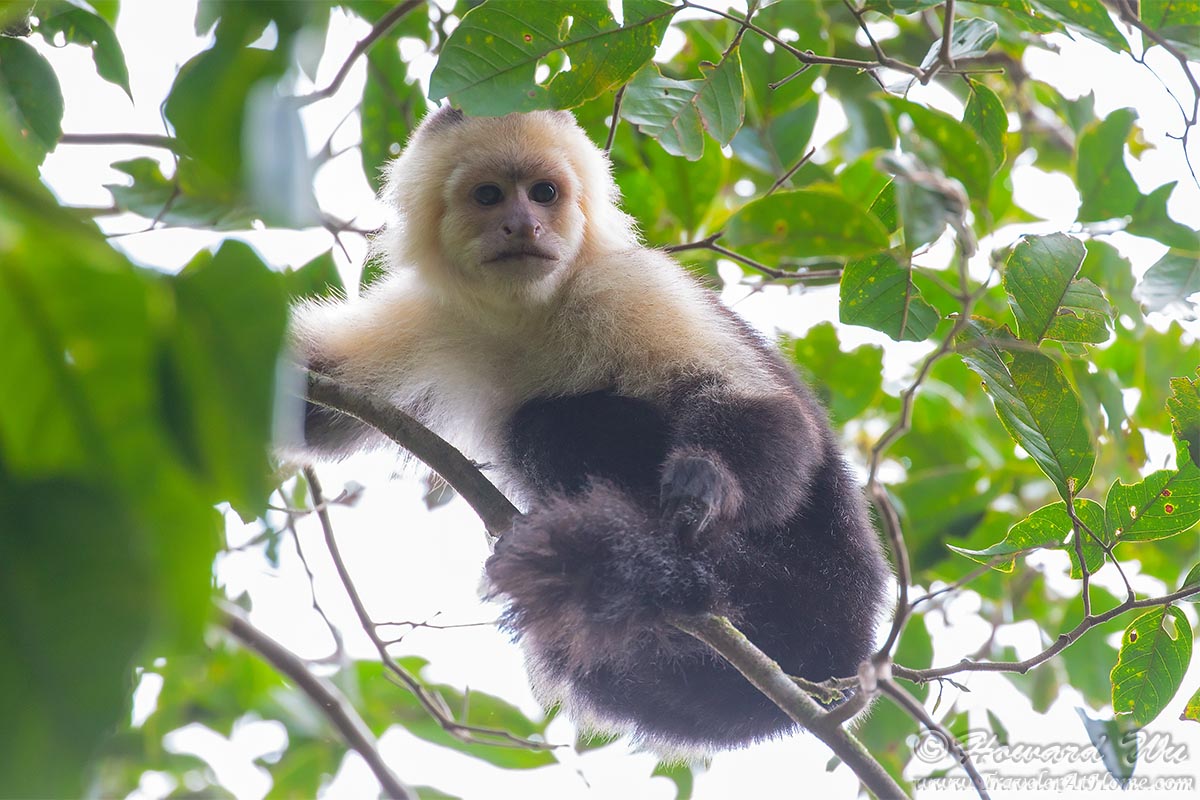 I much preferred to stay there a little longer, but the viewing area of the waterfall is rather small and it was crowded, and our group had to push on. So we continued on the trail. At one crossing over the river, a group of noisy White-faced Capuchin Monkeys arrived. Through the dense foliage and against heavy backlighting I took this picture. I would get much closer to these monkeys later on this trip, but I was pretty happy with this shot at the time.