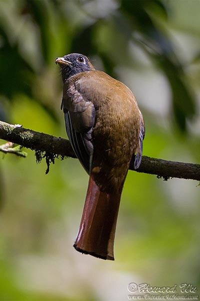 But on the same day, in the same area, just moments later, I spotted another male (not shown) and female (shown below) with red bellies (there is another picture of the bird below that shows part of its belly). Thus, in two days, I spotted 2 female trogons, 2 male trogons (or 1; the second male could be the same bird as the one seen the day before), of 2 different species, or 2 different color morphs of the same species. Go figure!