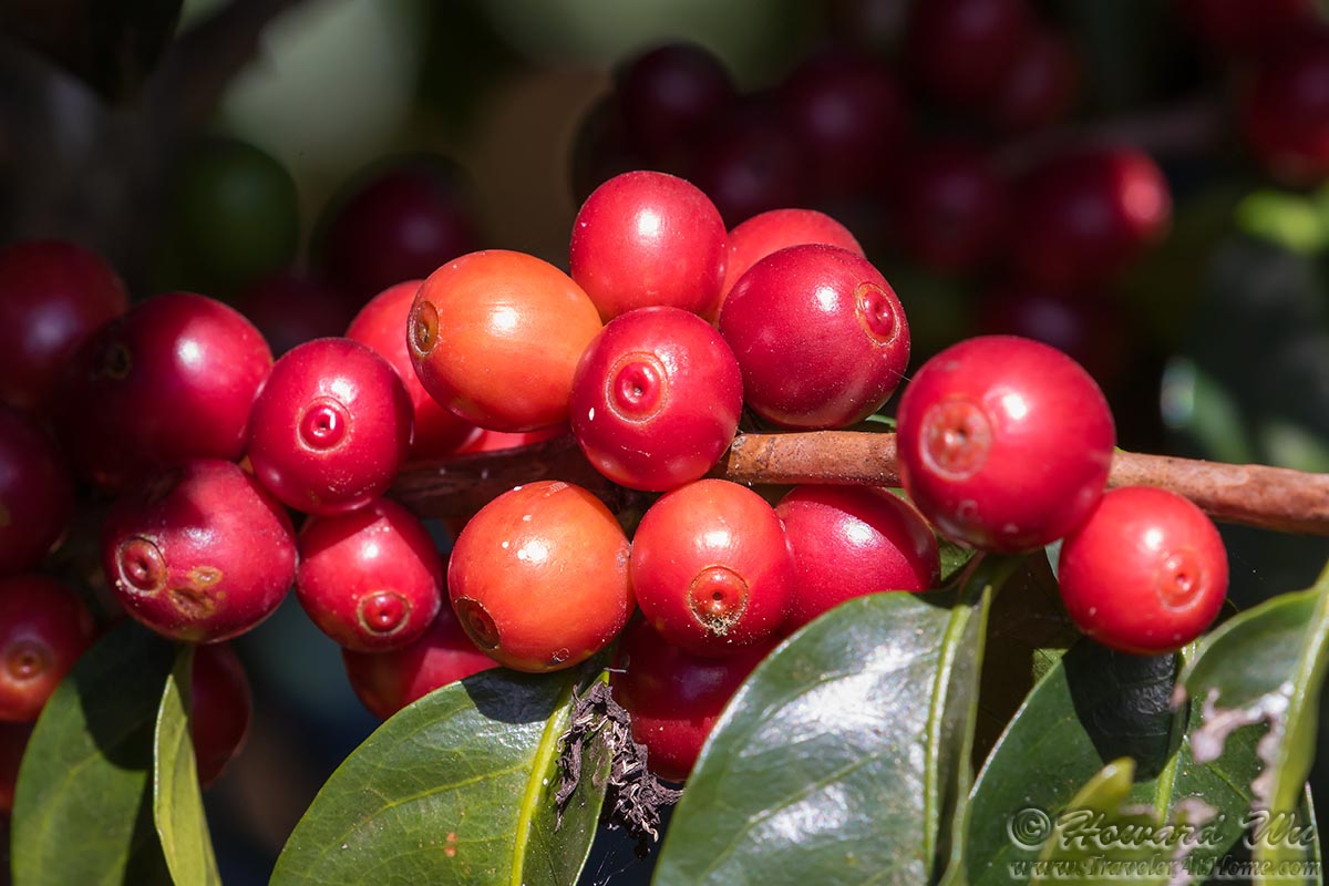 The coffee beans are ripe for the picking; the pulp is surprisingly sweet and tasty, but there is too little of it to be made for consumption.