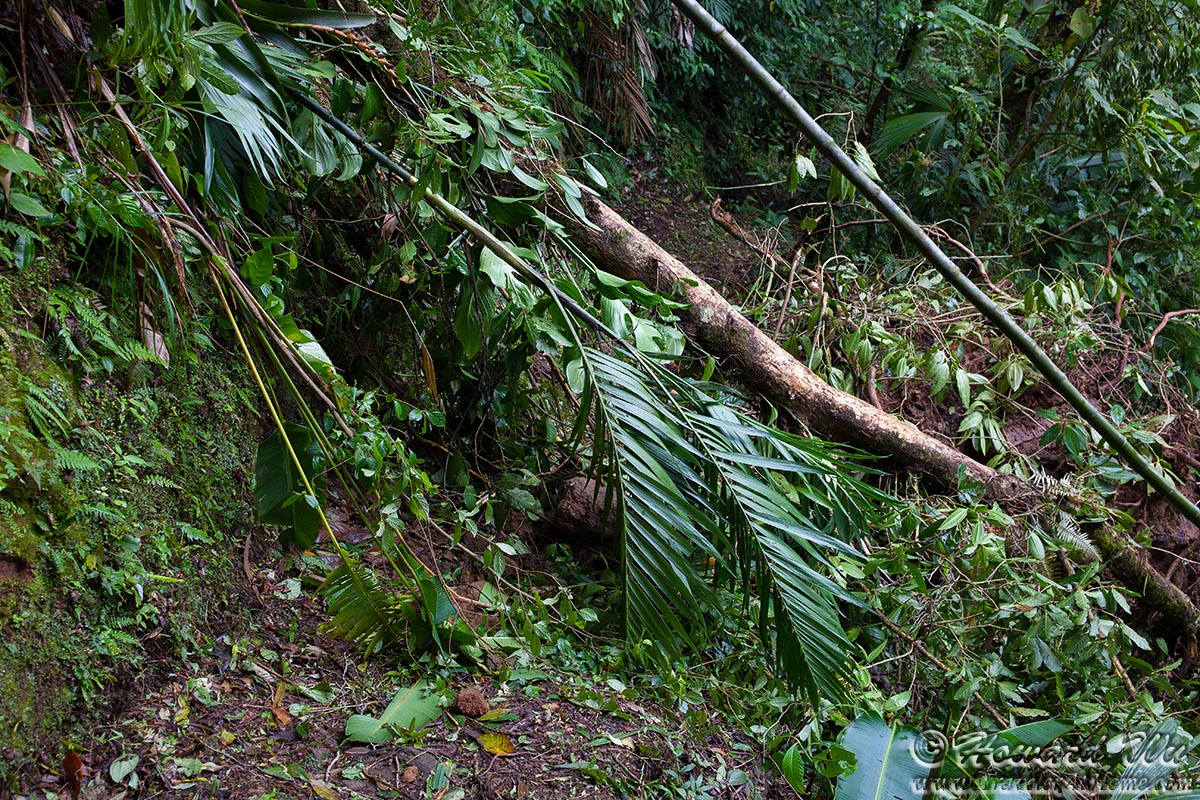 On one of the days there I tried to take a hike to a waterfall (this would be Catarata Fatima) inside the national park. However, I was stymied by a downed tree near the end of the trail. The picture is deceptive -- half of the trail in fact collapsed (hidden by the palm leaves) and the rest of it looks very soft and unstable due to the recent downpours. I did the prudent thing and turned back.