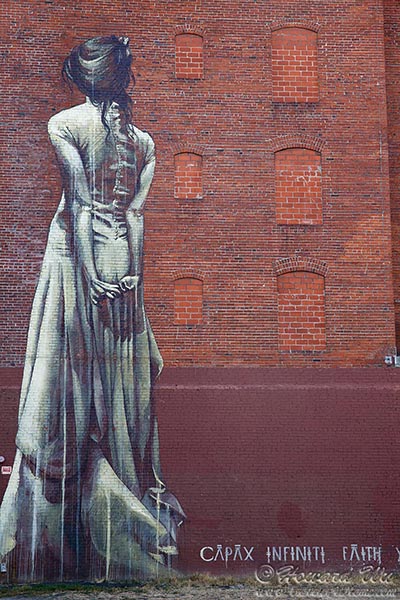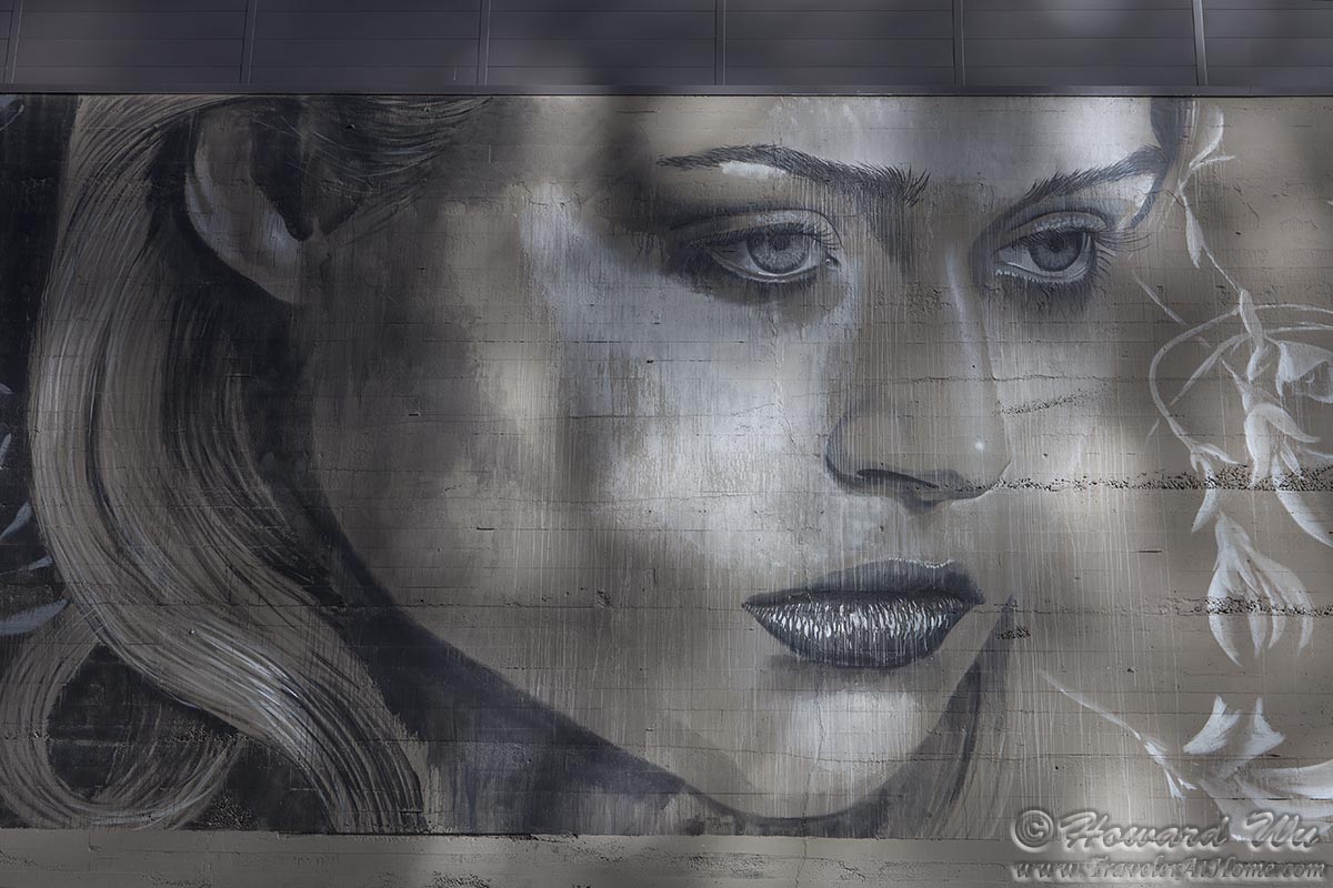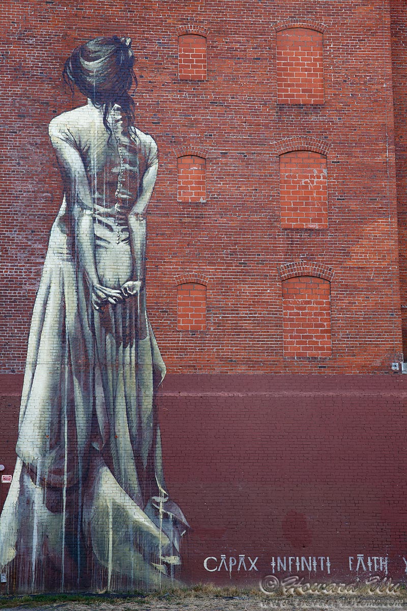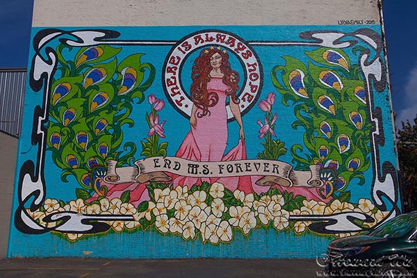 Even in a parking lot in downtown, there was an interesting mural. I later found out that this one was created by Lydia Emily, a street artist and cancer surviver, the M.S. stands for "Multiple Sclerosis".