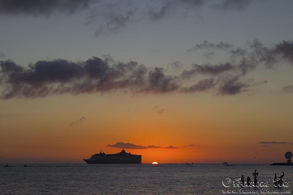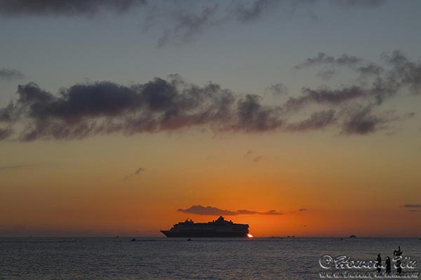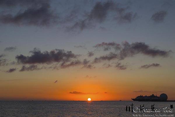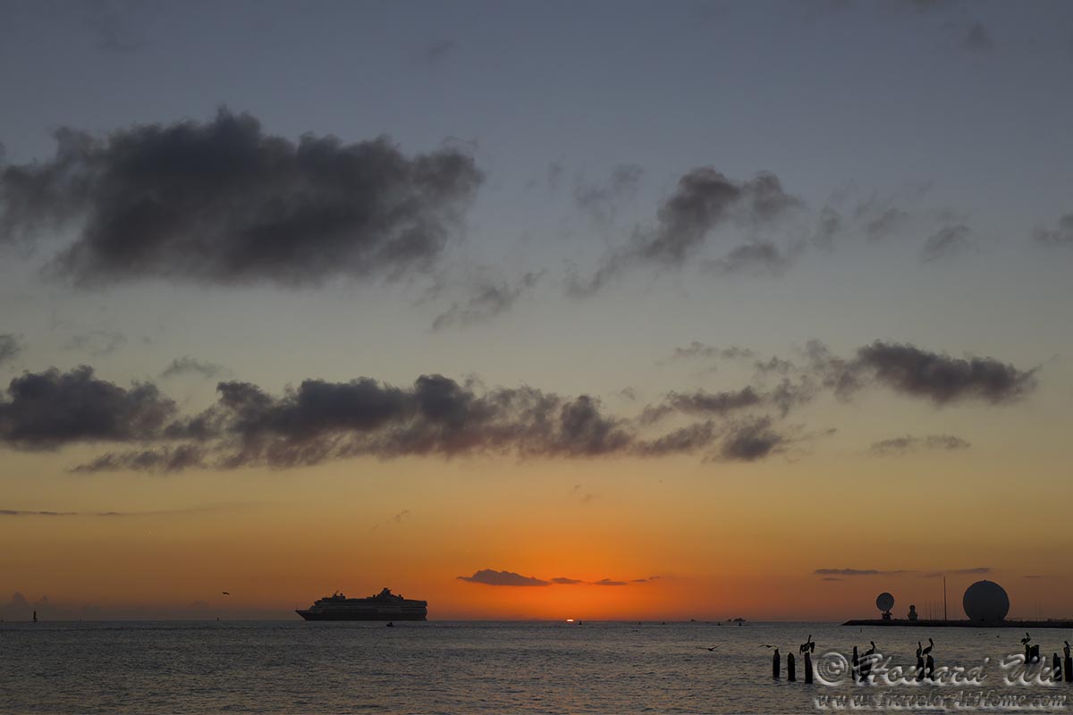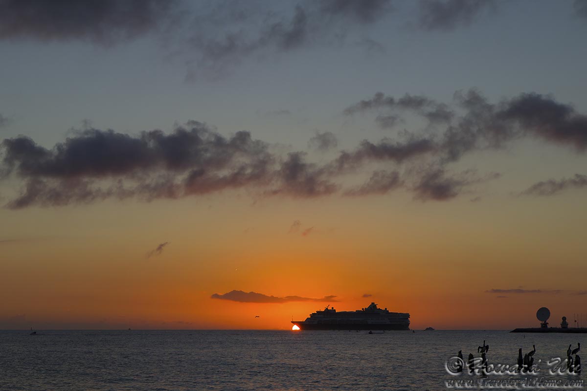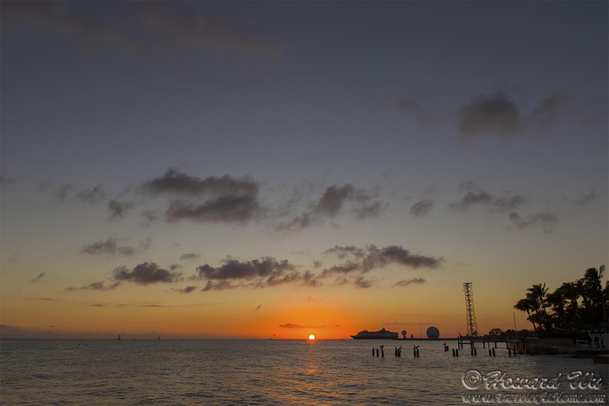 We finally settled on the pier outside The Southernmost Beach and waited for sunset. This was a fine sunset, if not a spectacular one (it lacked illuminated cloud patterns). But just when the sun was setting, a cruise ship slowly passed in front of it -- this was the biggest "photobomb" I have personally witnessed! Fortunately, the ship did not block the first and last moment of the sunset.