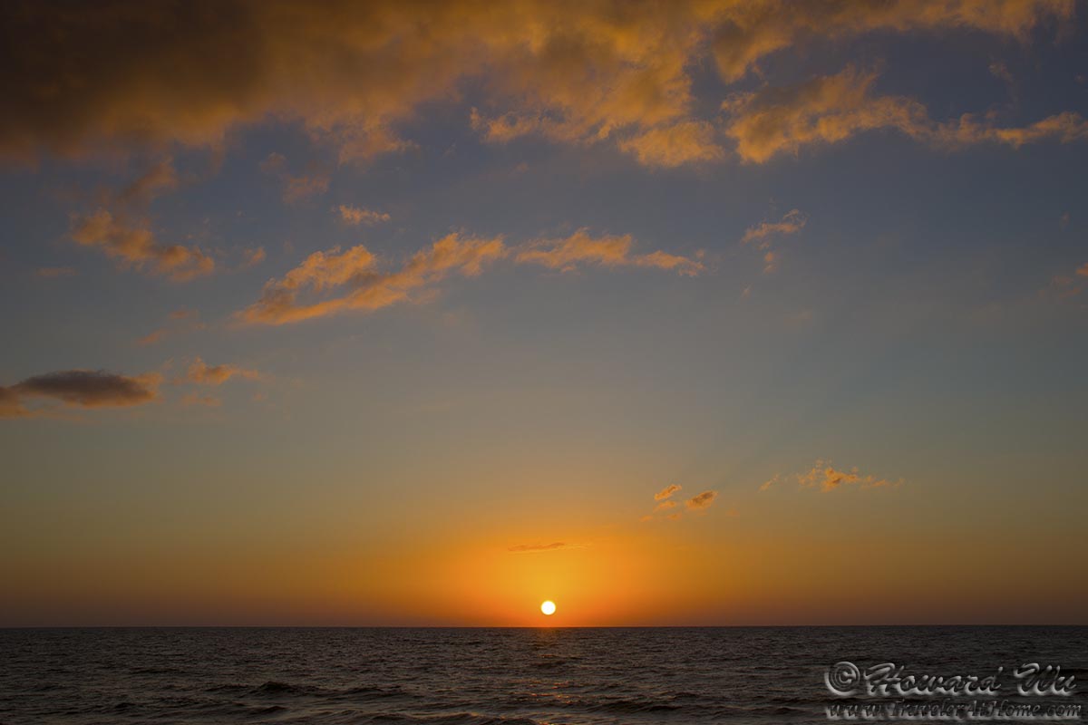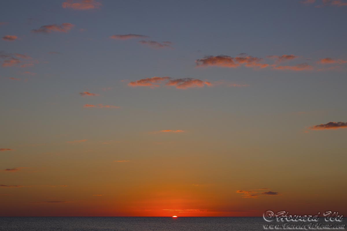 The great Heraclitus once said "You can not step twice into the same river", I say: you can not watch the same sunset twice. Every sunset is unique and beautiful in its own way -- sometimes the sun is clearly visit and sets like a shiny disk, sometimes it is veiled by bands of clouds that create subtle hues, sometimes the cloud formation in the sky is spectacular ... I never tire of watching sunsets.