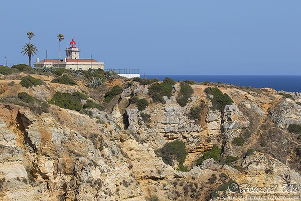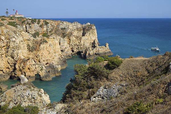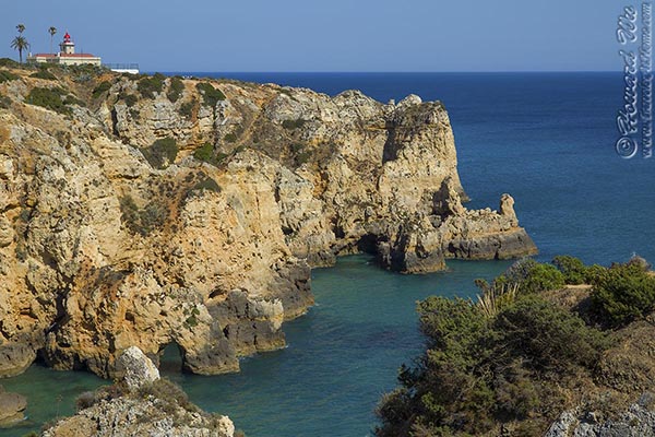 Its lighthouse -- Farol Ponta da Piedade is a prominent structure standing high on the cliff, overlooking the Atlantic Ocean.