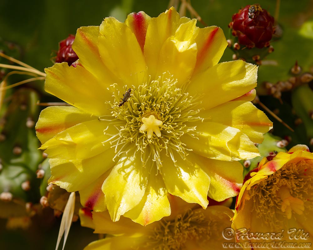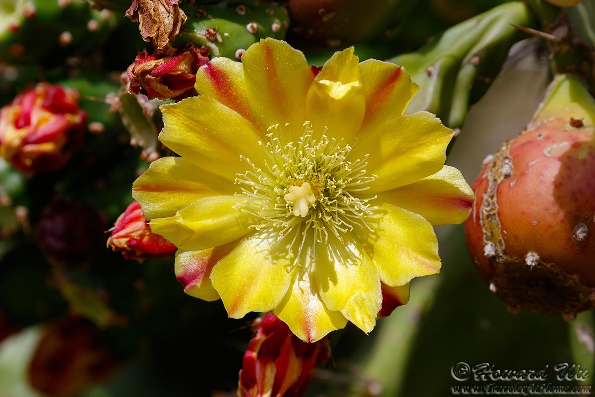 One of the houses there had clusters of cactus near its fence that were blooming. Their yellow flowers are magnificent. They are not native though (cacti are native to the Americas).