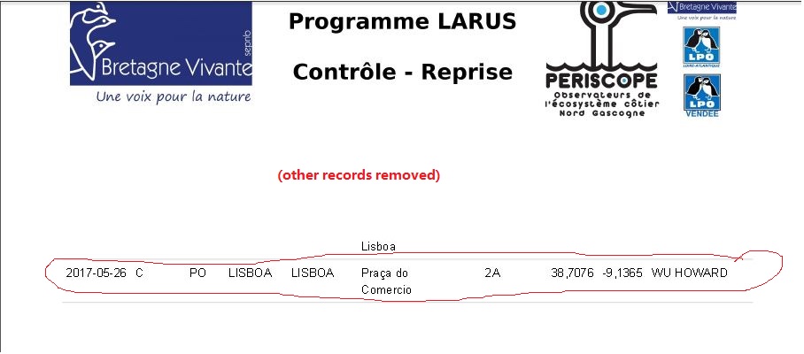 Update (Oct. 26, 2017): today I received the official report (it was reported by a friendly British birder on my behalf) confirming this sighting that the bird is a Lesser Black-backed Gull, banded in Ile D’Yeu, an island south of Saint-Nazaire in Brittany, France. See a snippet of the report here.