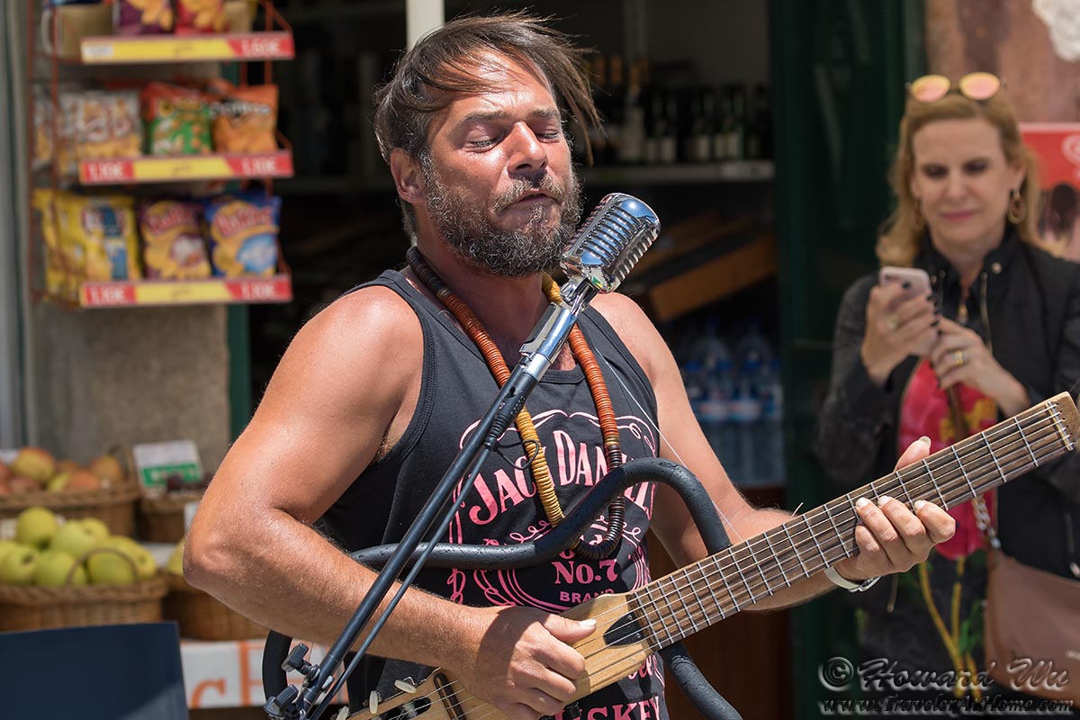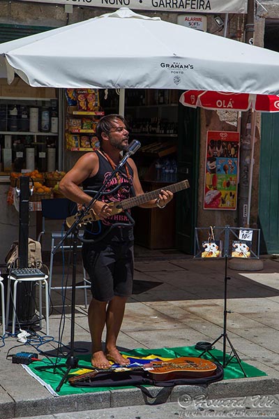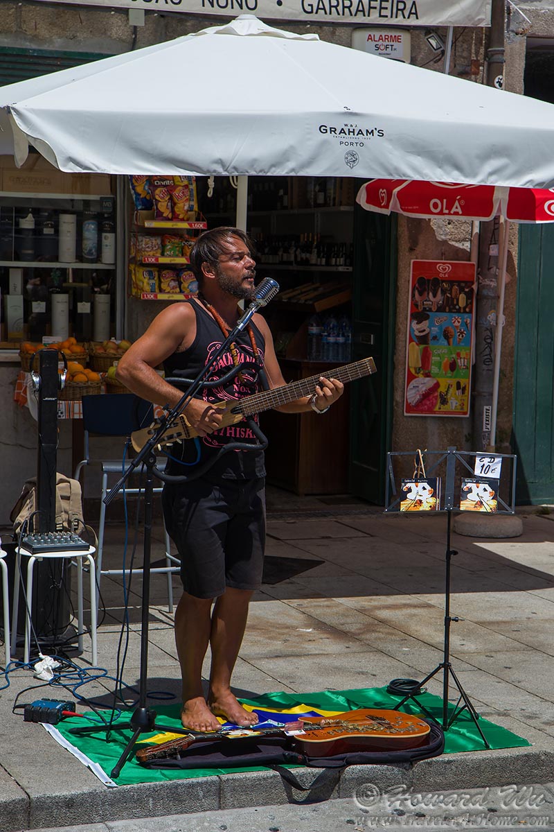 We walked across the Douro on the lower level of the Dom Luis Bridge, to the water front on the north side. A very popular musician, apparently Brazilian (notice the Brazilian flag under his feet), was holding court and attracted a large crowd.