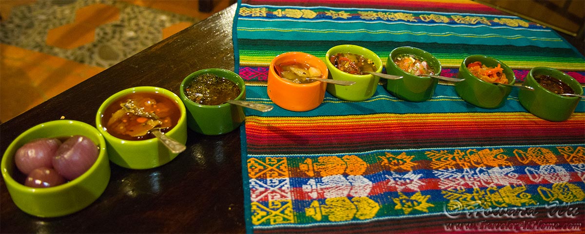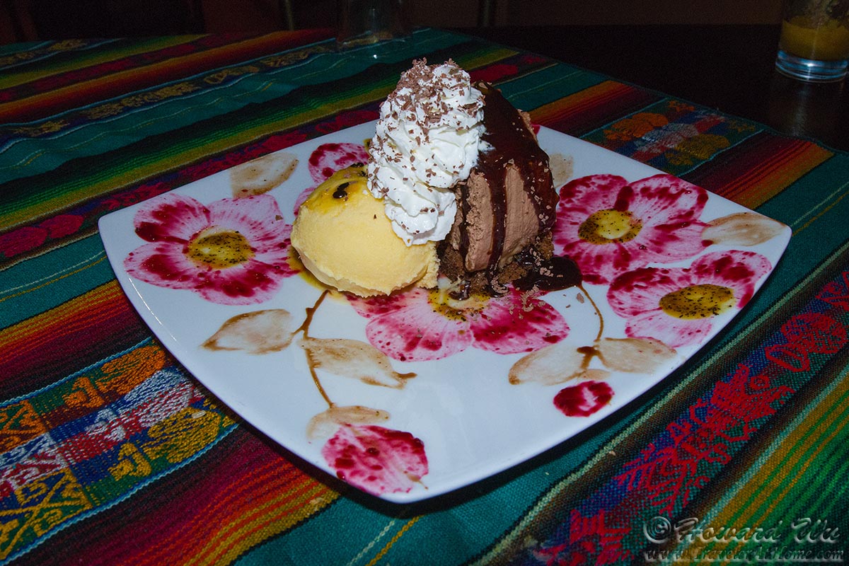 In Cuenca, our best (and most expensive) meal was had at Tiesto's, a "modern Ecuadorian" restaurant. It is quite excellent, once you get over the price. From the start with an array of sauces and pickled vegetables, to the end with a beautifully decorated dessert, the food dazzles one's palate (and eyes).