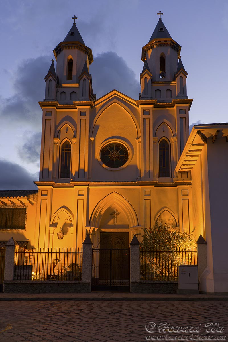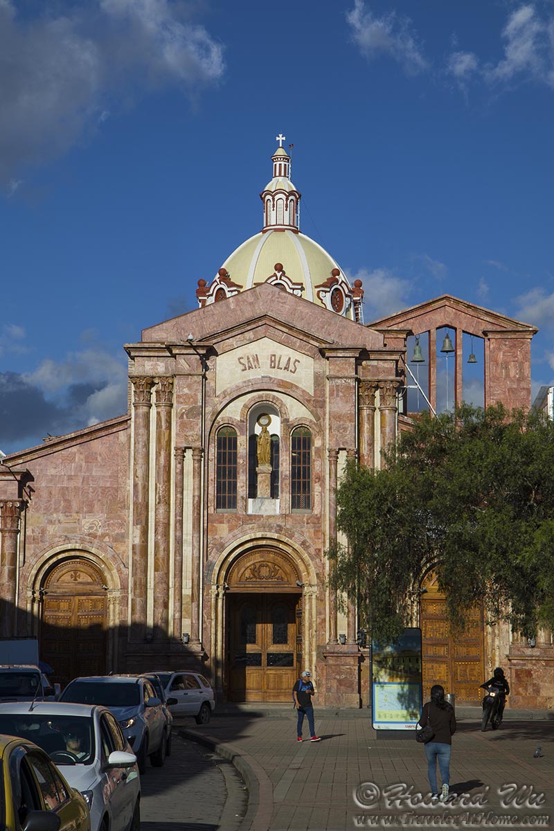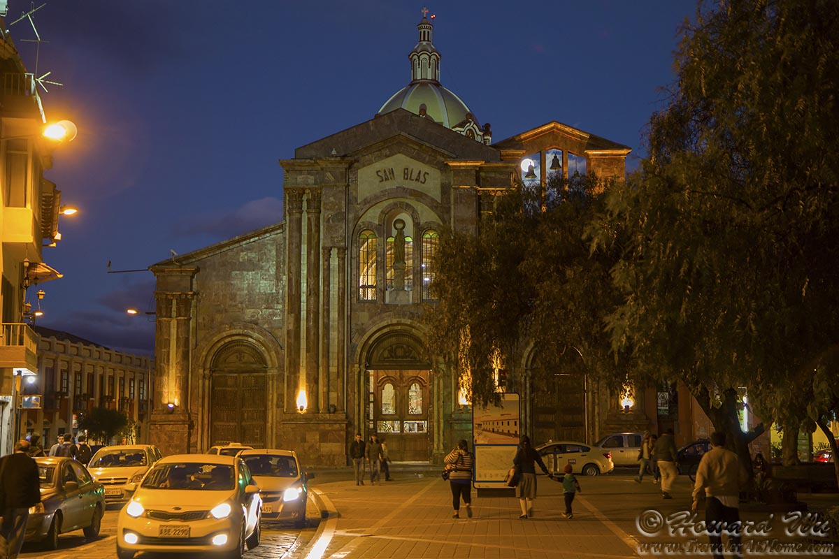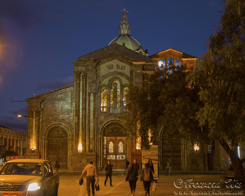 After settling in, we took a walk in town. Our hotel, Casa San Rafael, basically sits almost equal distance between two plazas: the larger Parque Calderon which is the main plaza in Cuenca, and the smaller Parque San Blas, both within just a few minutes of walk. As night fell, we walked to the smaller plaza. Iglesia de San Blas (San Blas Church) which sits at the eastern end of this plaza, quickly became our favorite church. It is really picturesque, especially at this moment when the full moon was rising behind its belfry.