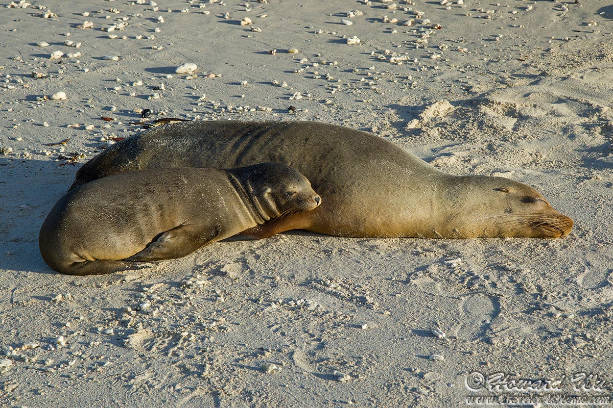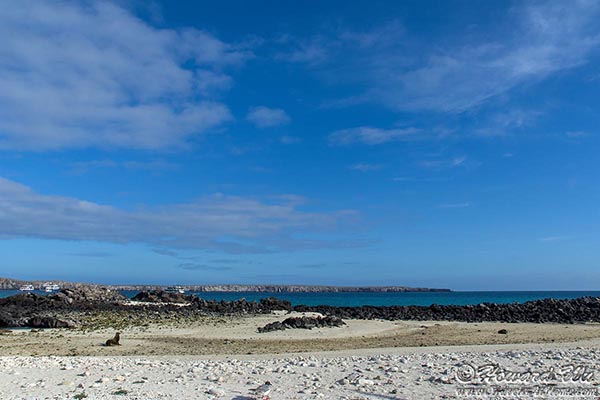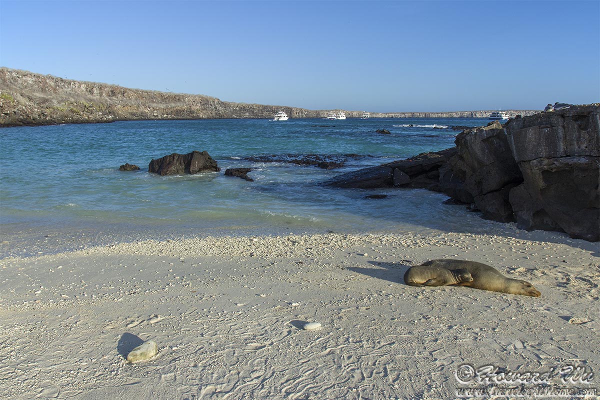 Galapagos Sea Lions were playing in the water, or, when tired, resting on the beach.