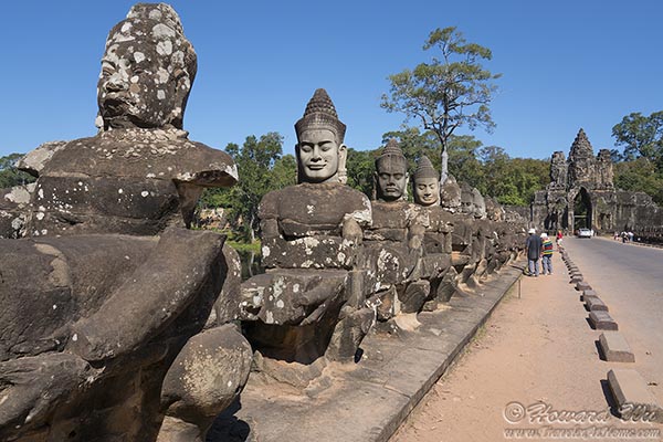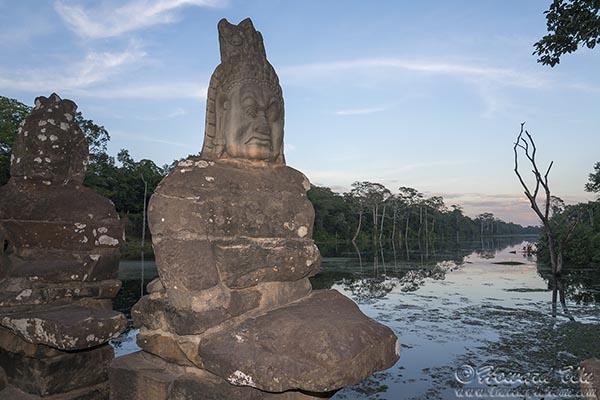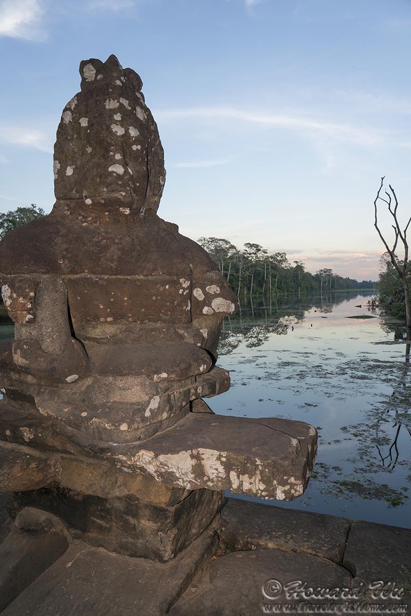In the dusk we went to the South Gate of Angkor Thom, where a series of stone statues of guardian gods on either side of the bridge over the moat are depicted as holding a giant serpent (a famous Khmer myth).