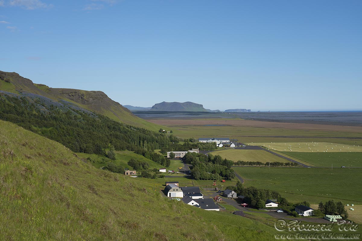There is a trail with steer staircase on the slope beside the waterfall leading to the top of it. We climbed to the top. While the view of the waterfall was the best from the bottom, from the slope, the view of the coastal plain was expansive and liberating of one's spirit. It is hard to imagine that the cliff that Skogafoss tumbles down from was once a sea cliff, now the ocean seemed rather far away. We could also see Dyrholaey, the sea arch, in the distance.